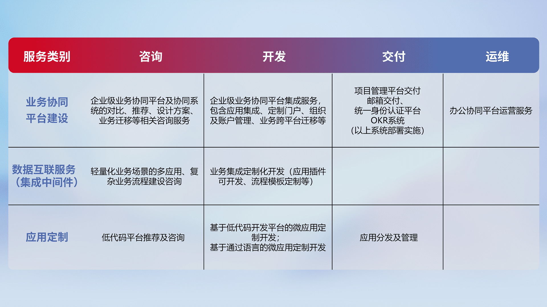 针对钉钉、、、企微、、IDaas等平台级产品提供产品的规划、、方案、、、、交付、、、定制化开发等服务,,,实现如统一协同办公、、、、智能客户服务、、、混合会议管理、、、智能数据查询、、、等业务场景,,,实现数字化转型。。。。